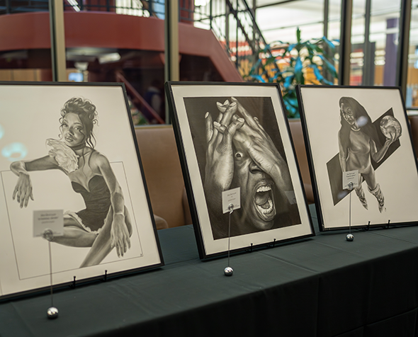 Artwork on display at the Incarcerated Artists Alliance 2nd Annual Exhibition at the Sturm College of Law.