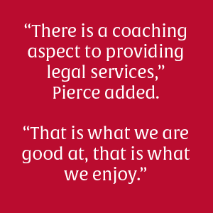 “There is a coaching aspect to providing legal services,” Pierce added. “That is what we are good at, that is what we enjoy.”